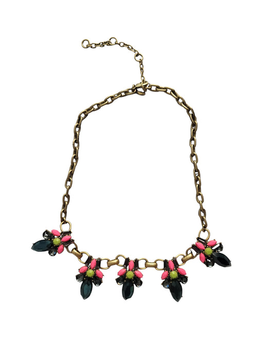 Necklace of Montana Blue, Opaque Hot Pink and Opaque Lime Rhinestones in Antiqued Gold Tone