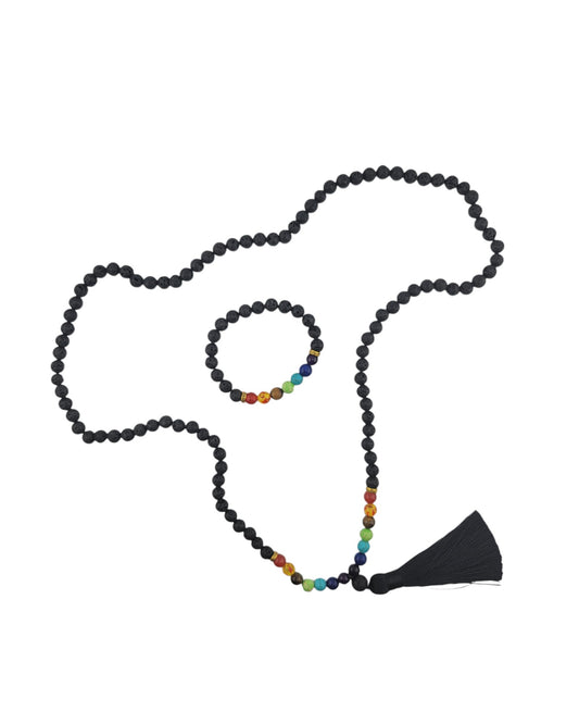 Black Lava Stone Chakra Mala Necklace & Bracelet Set